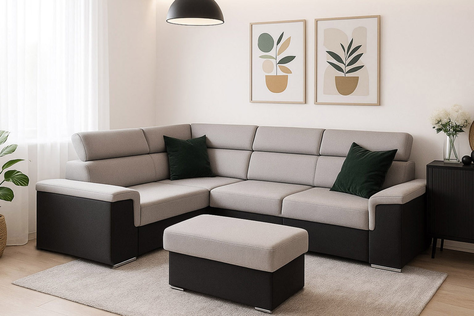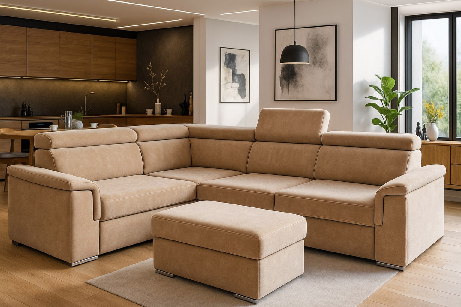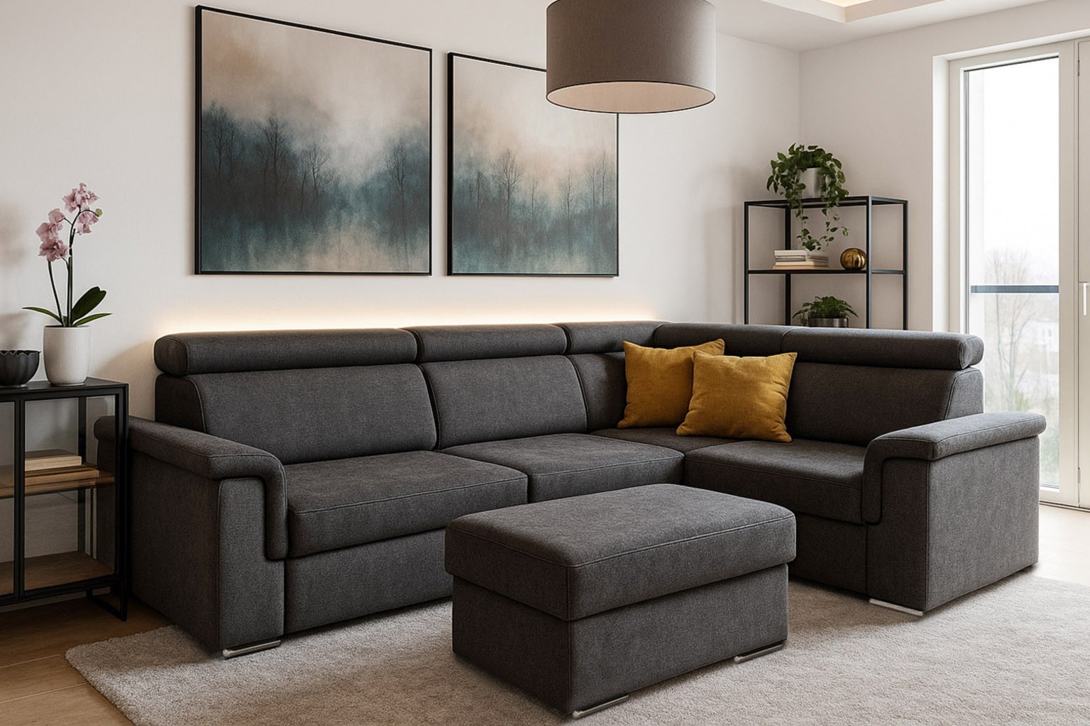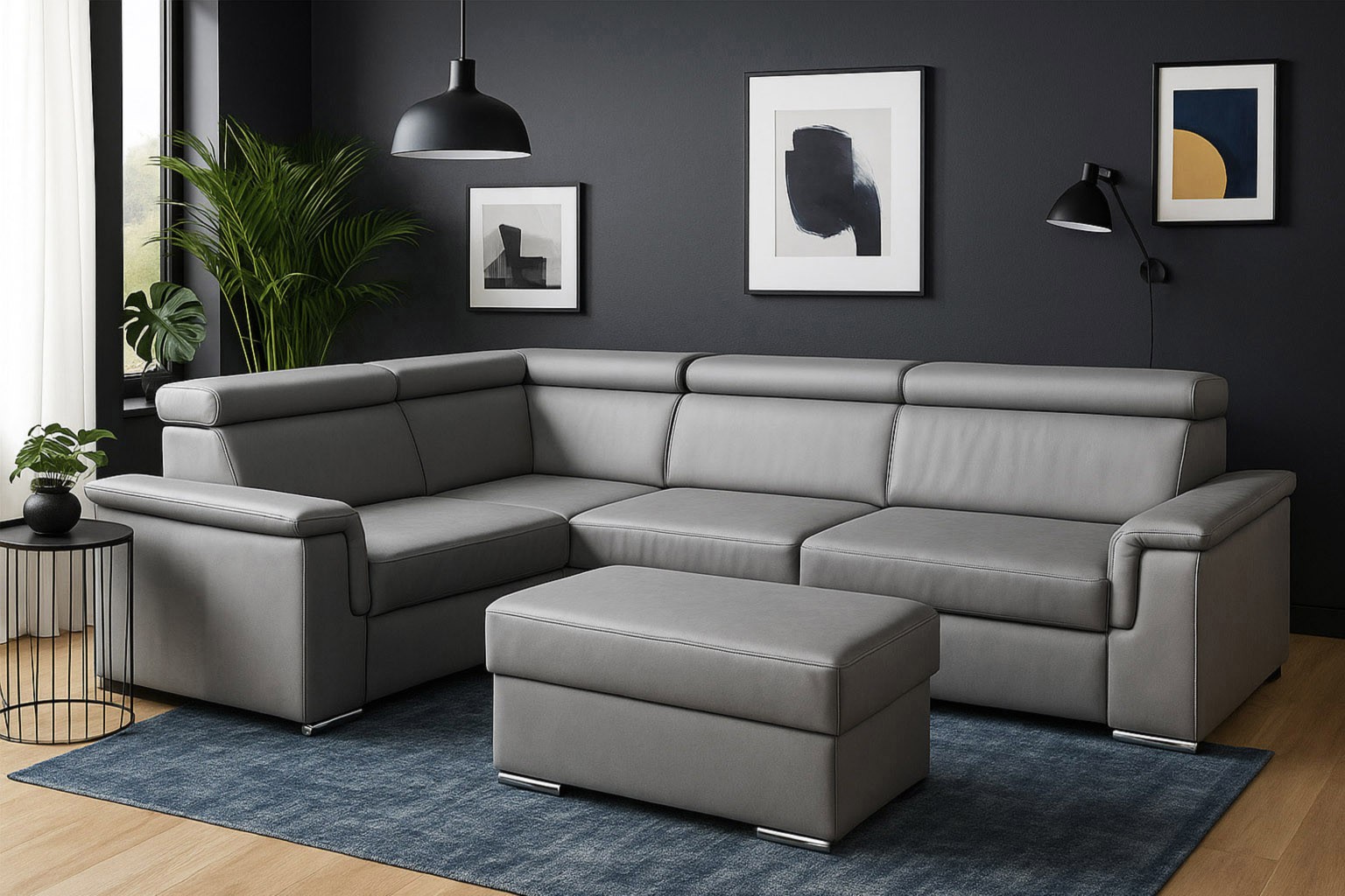 szerokość: 266cm / głębokość: 205cm / wysokość: 85-101cm / powierzchnia spania: 127x200cm; opcja: pufa/ wysokość: 42cm / szerokość: 48cm / głębokość: 91cm