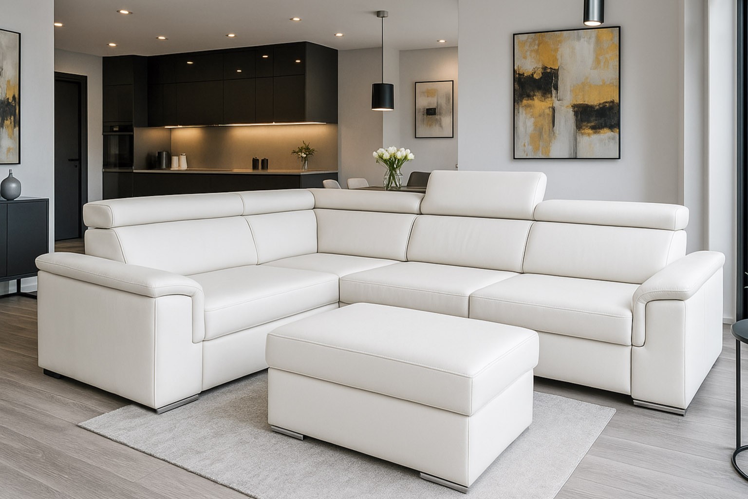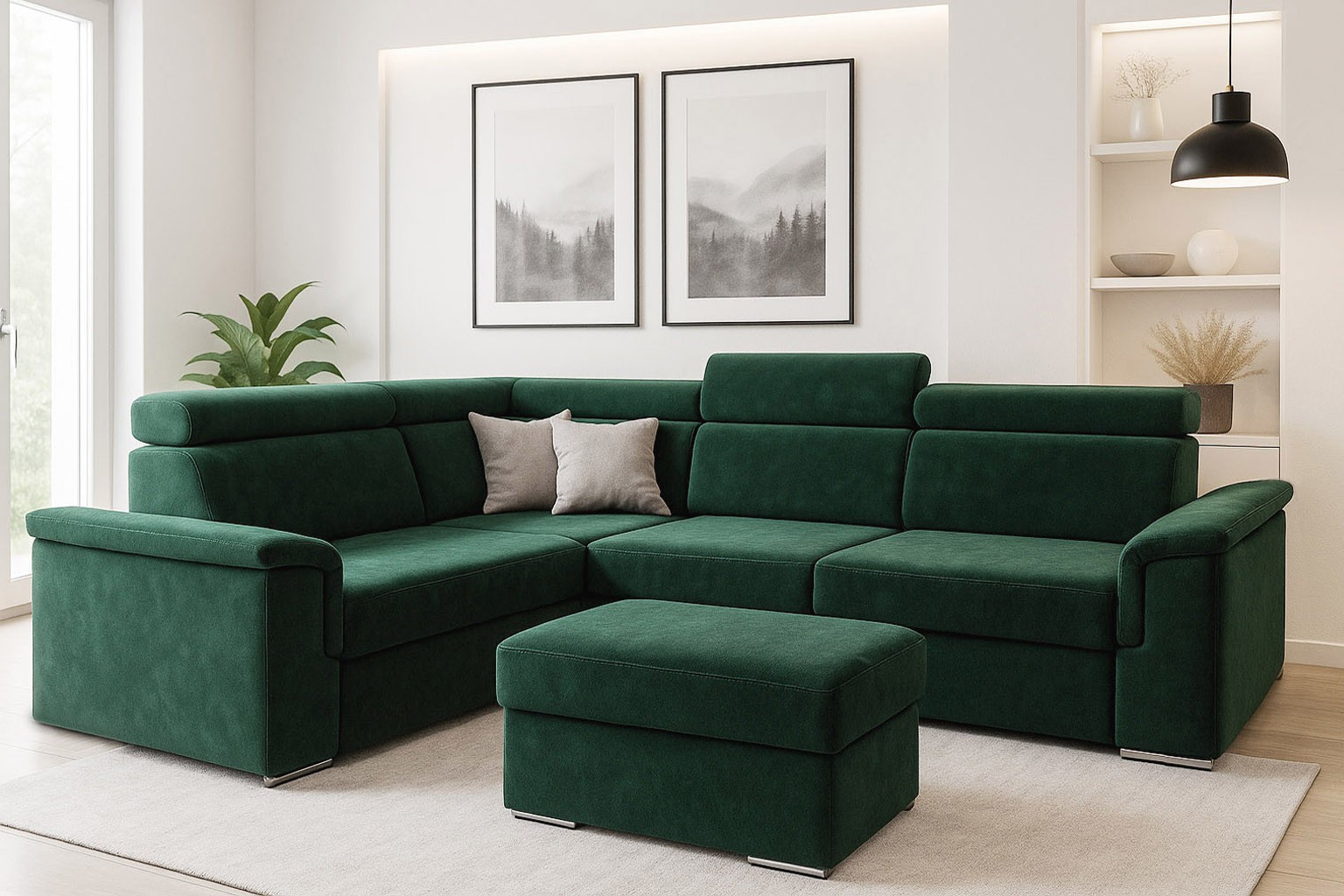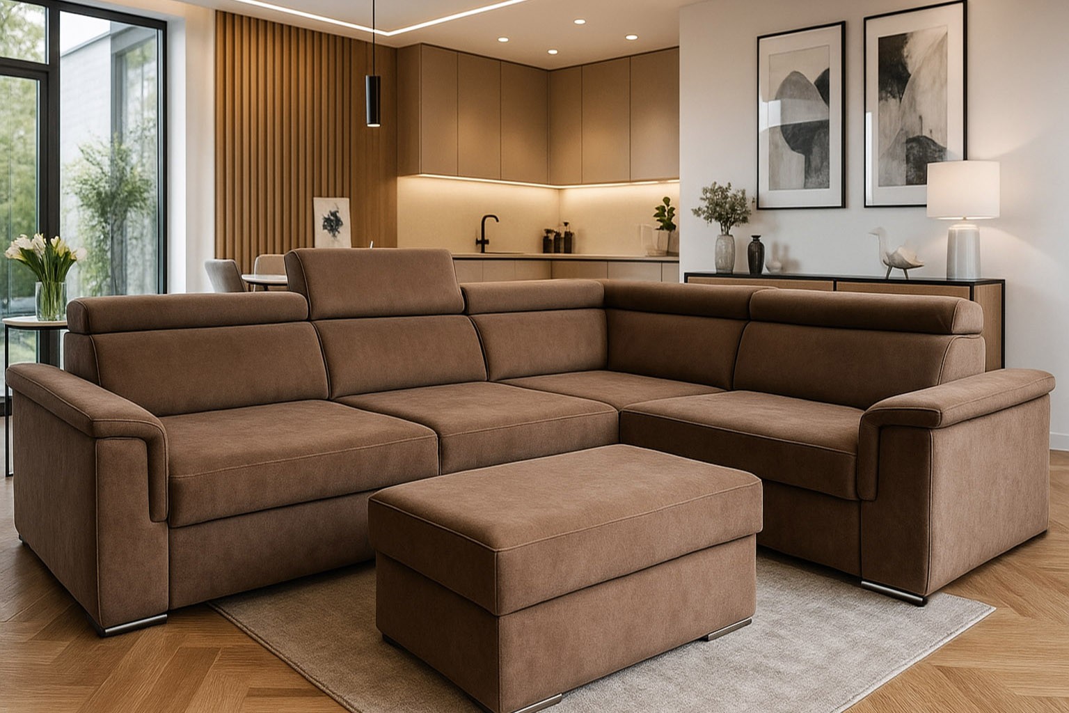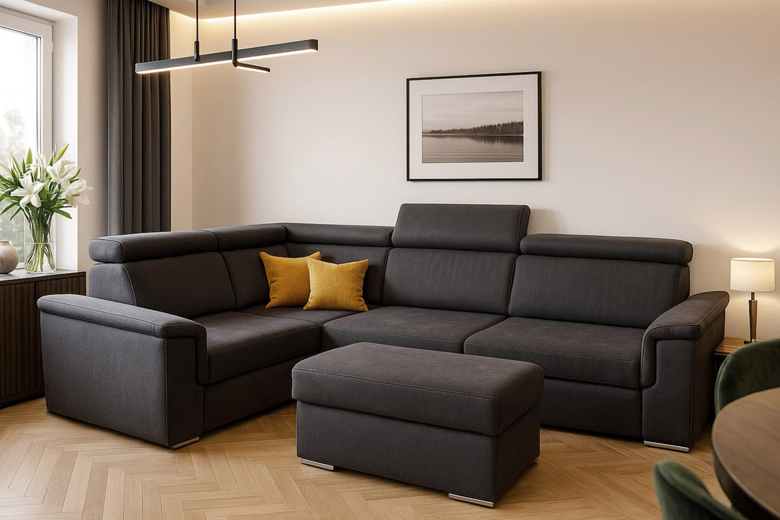 szerokość: 266cm / głębokość: 205cm / wysokość: 85-101cm / powierzchnia spania: 127x200cm; opcja: pufa/ wysokość: 42cm / szerokość: 48cm / głębokość: 91cm